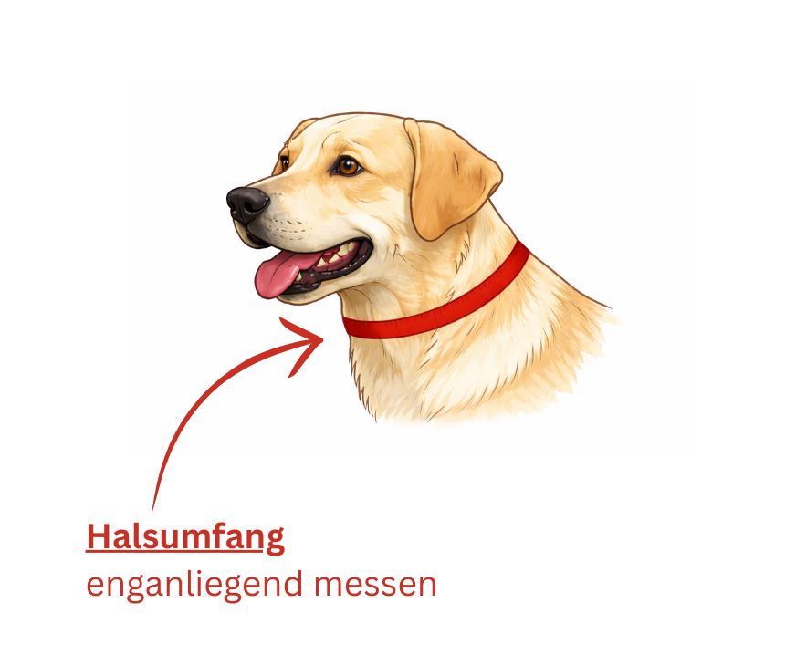 Lege das Maßband eng anliegend an der breitesten Stelle des Halses an, ohne Luft dazwischen. So erhältst du ein exaktes Maß für ein optimal passendes Halsband.